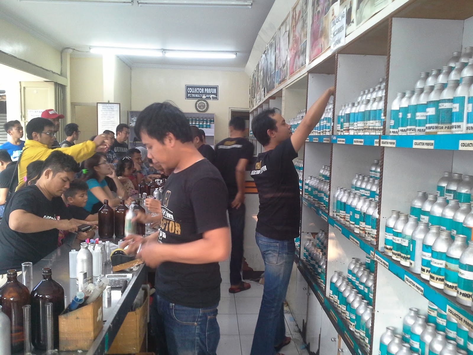 Setel beli kain semua, kami dibawa ke Collector Perfume. Kedai yang menjual minyk wangi ori. cube tengok pic kt bawah ni, betapa ramainya pelanggan yang datang. untuk membeli, pelanggan boleh tengok list nama perfume pada menu yg ada. kemudian tulis pada sekeping kertas kecil dan bagi pada jurujual. tunggu giliran, biler korang punya minyak wangi dah siap, dia akan panggil dan terus bayar. kalau ada cust nak test bau, dia akan calit sikit pada tangan. kata supir, kedai ni jual perfume ori, tak campur mcm kedai lain. sebab tu pelanggan ramai. memang aku ada nampak kedai perfume lain yang diseberang jalan. lengang kot. kedai ni tak pernah surut orang. kami yang nak beli banyak ni, duduk belah tepi. sambil tgk list, sambil tengok gelagat org.